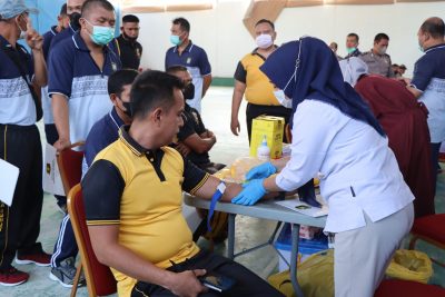 TANJUNG BALAI – Kapolres Tanjungbalai AKBP Triyadi SH. SIK, mengikuti kegiatan pemeriksaan kesehatan berkala Tahun 2022 beserta seluruh Personil Polres Tanjungbalai terdiri dari 134 Personel dengan rincian 115 Personel Polres Tanjungbalai dan 19 Personel Brimob Kompi 3 Yon B Polda Sumatera Utara ( Sumut ), Jumat 20 Mei 2022, sekitar Pukul 08.30 Wib di Gor Wira Satya Polres Tanjungbalai.